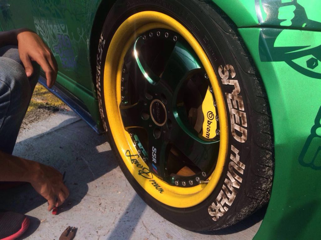 Here’s what happens when you cheap out and go with a non-official tire lettering.