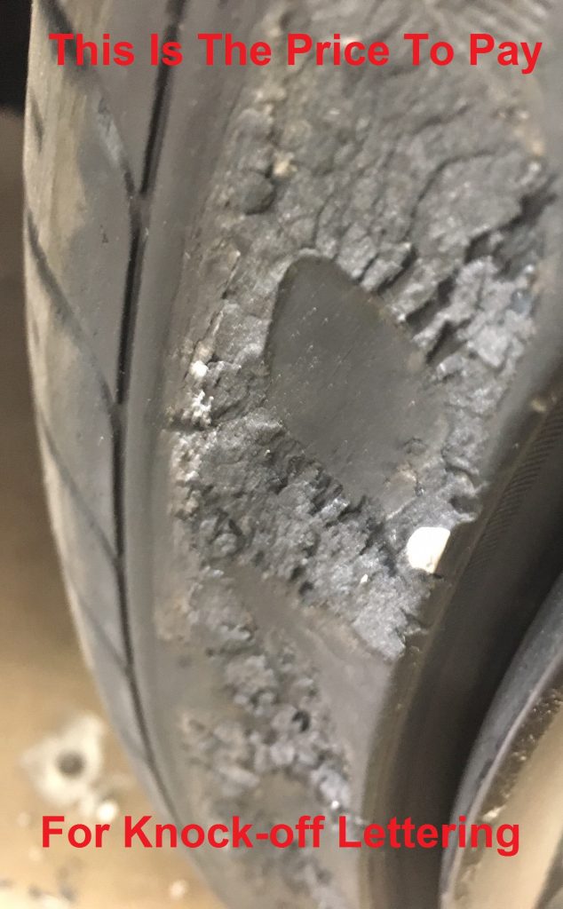 - Peeling: Due to poor quality adhesive, knockoff lettering isn’t guaranteed to stay stuck and then you’re out of luck. Most imitators use a standard super glue, "gorilla glue" or similar to bond to the tire rubber. The short term result is going to be a poor quality bond because of the dynamic conditions the tire sidewall experiences. Even glue designed for rubber will not be enough to last the lifetime of the tire.